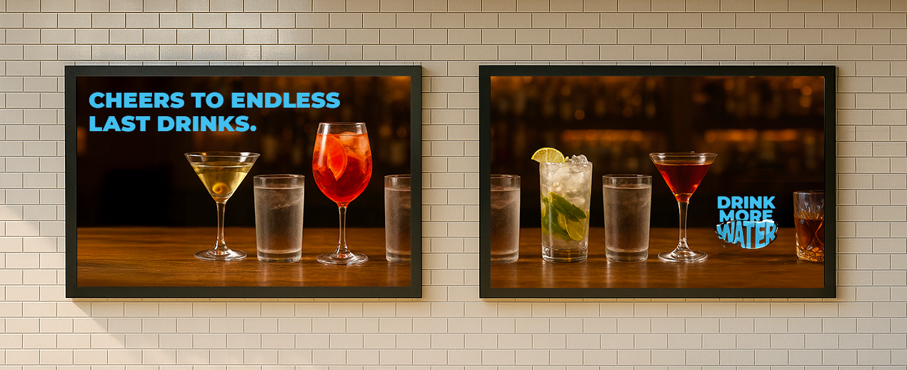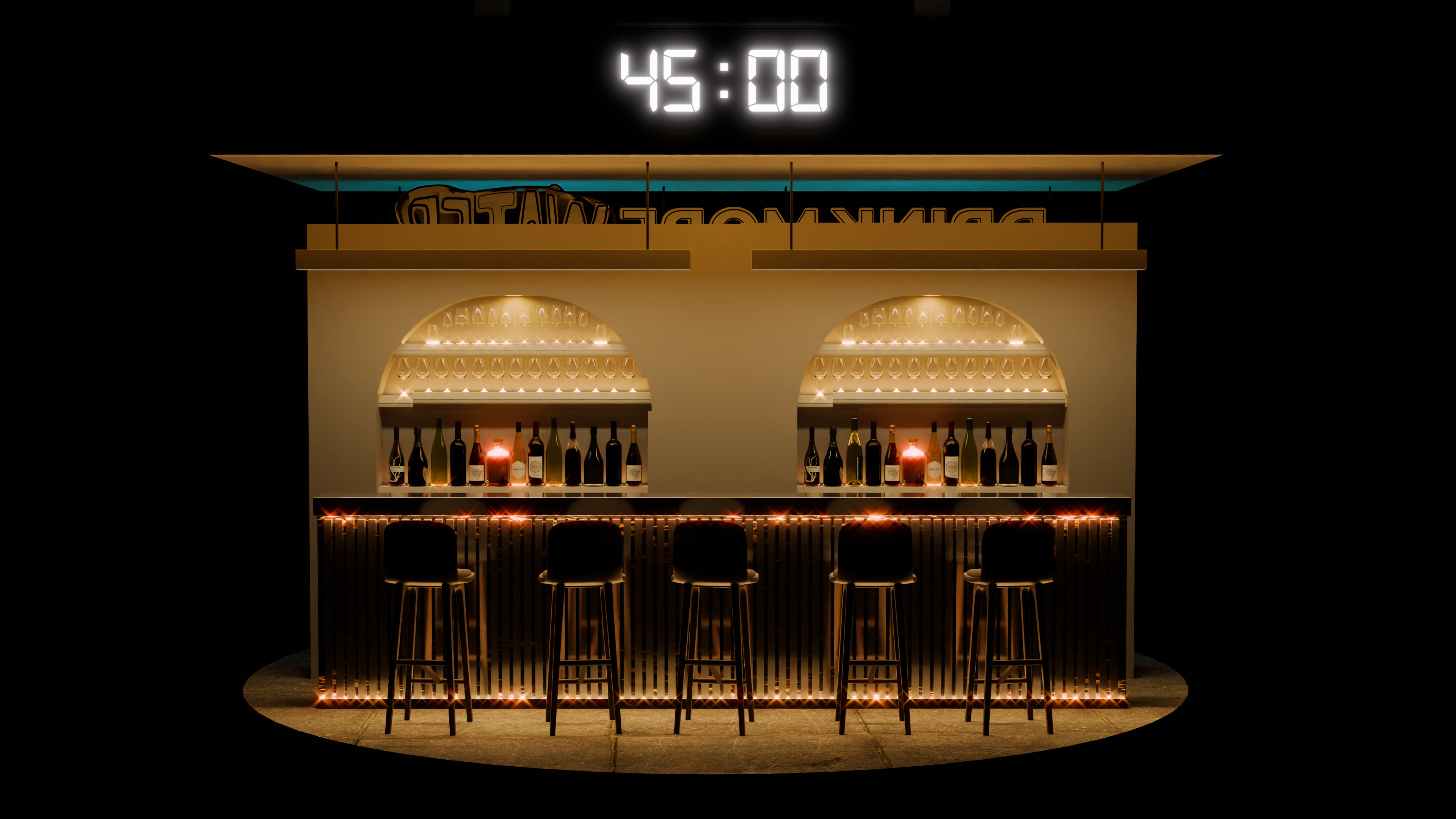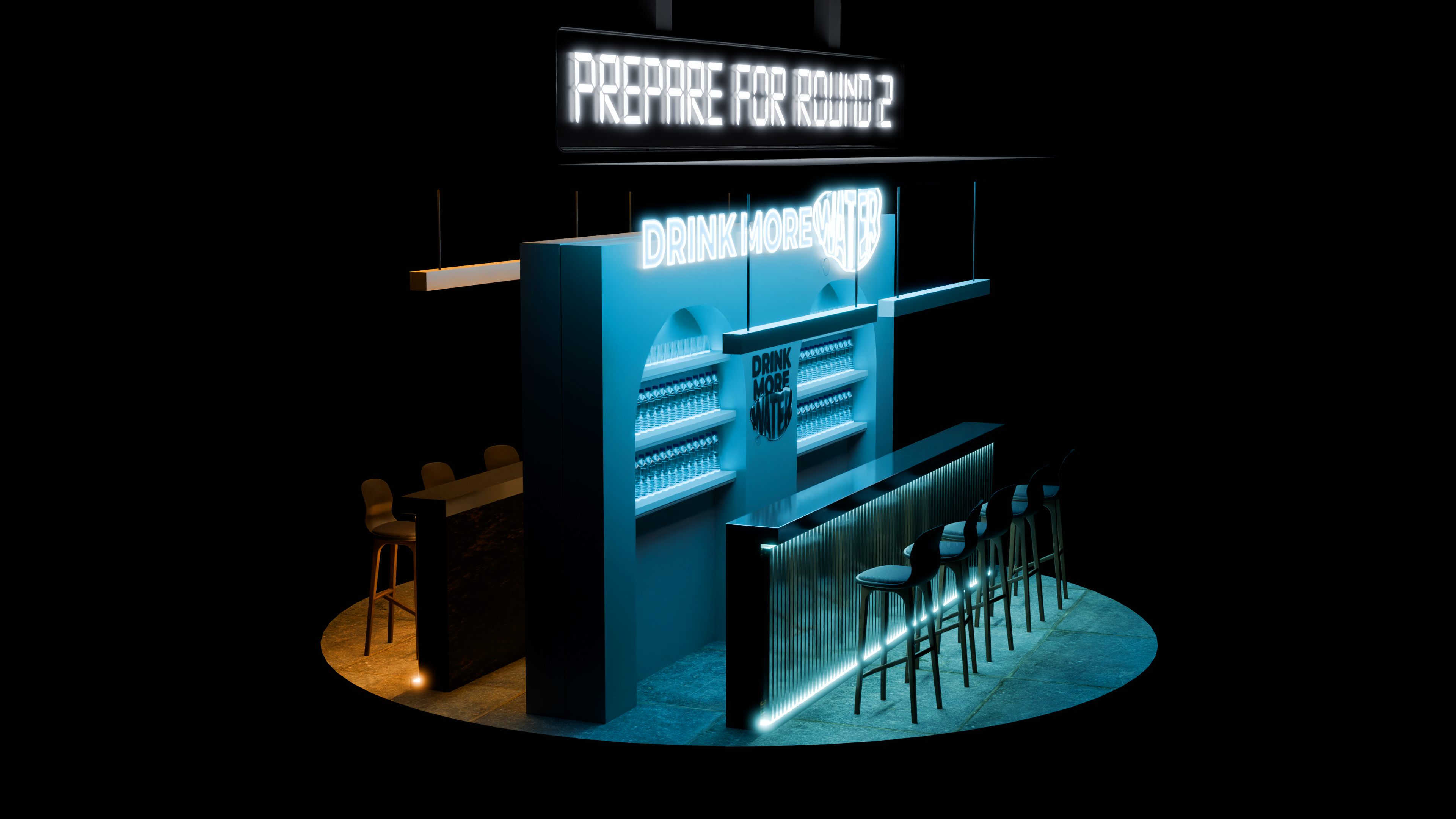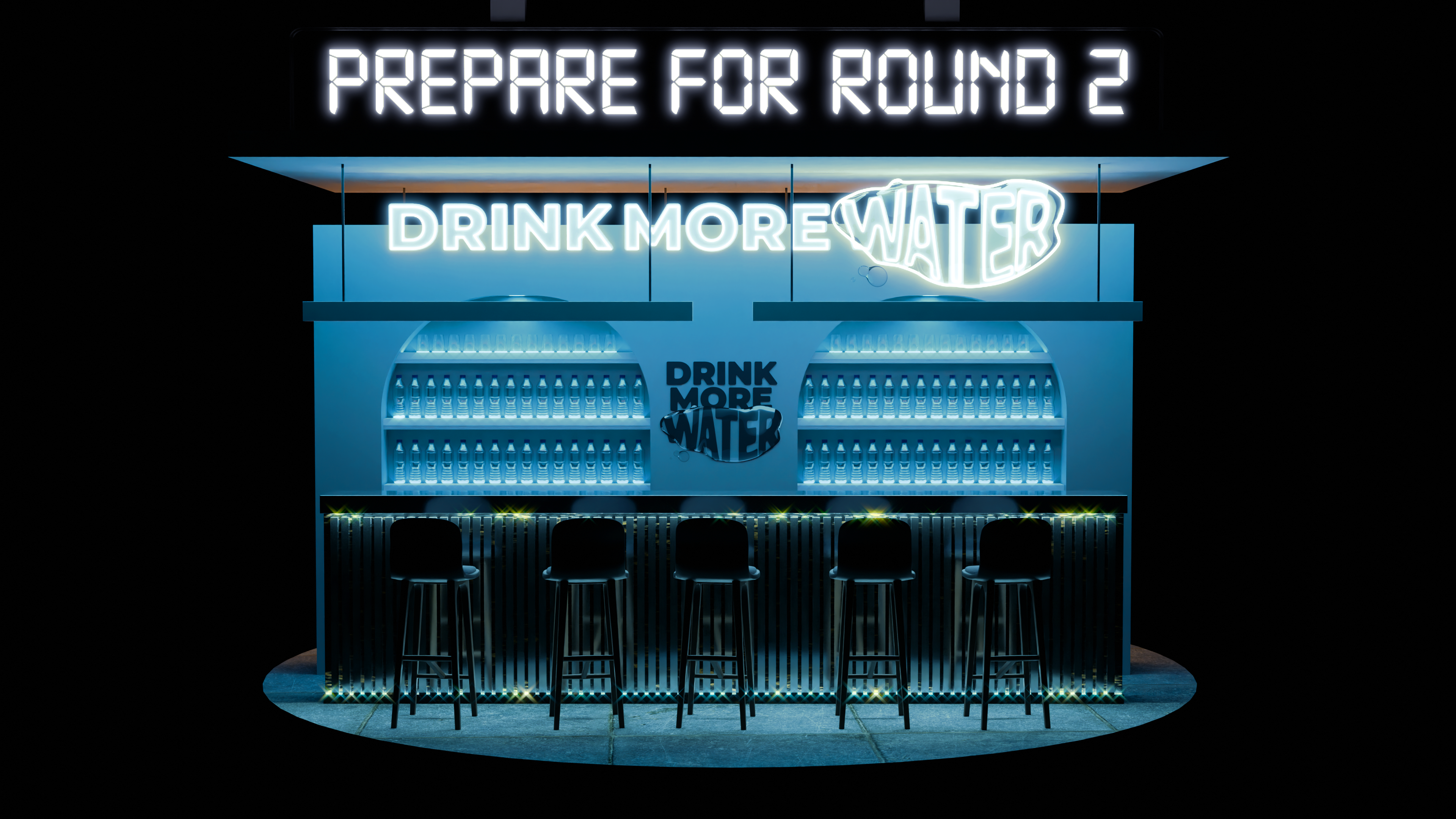 Montrer l'infinité de la soirée grâcec à une file sans fin qui alterne entre eau et cocktail.