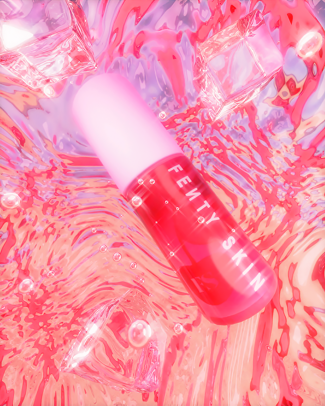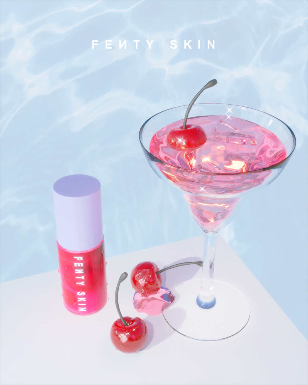 Réalisation de visuels publicitaires pour le lip oil de la marque Fenty Skin. Réalisés en 3D sur Blender, ces visuels s'imprègnent de l'esprit estival et coloré de la marque. Ici, un parallèle est fait entre la texture du lip oil, qui apparaît comme aussi rafraîchissant et agréable que le fait de boire un cocktail en été.