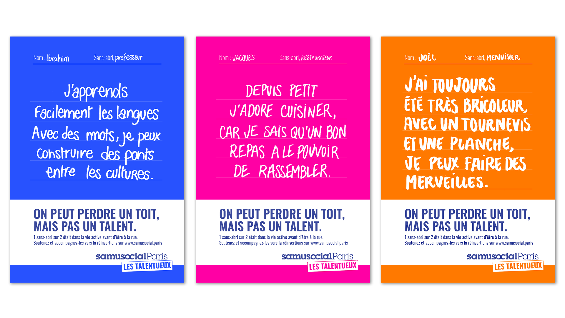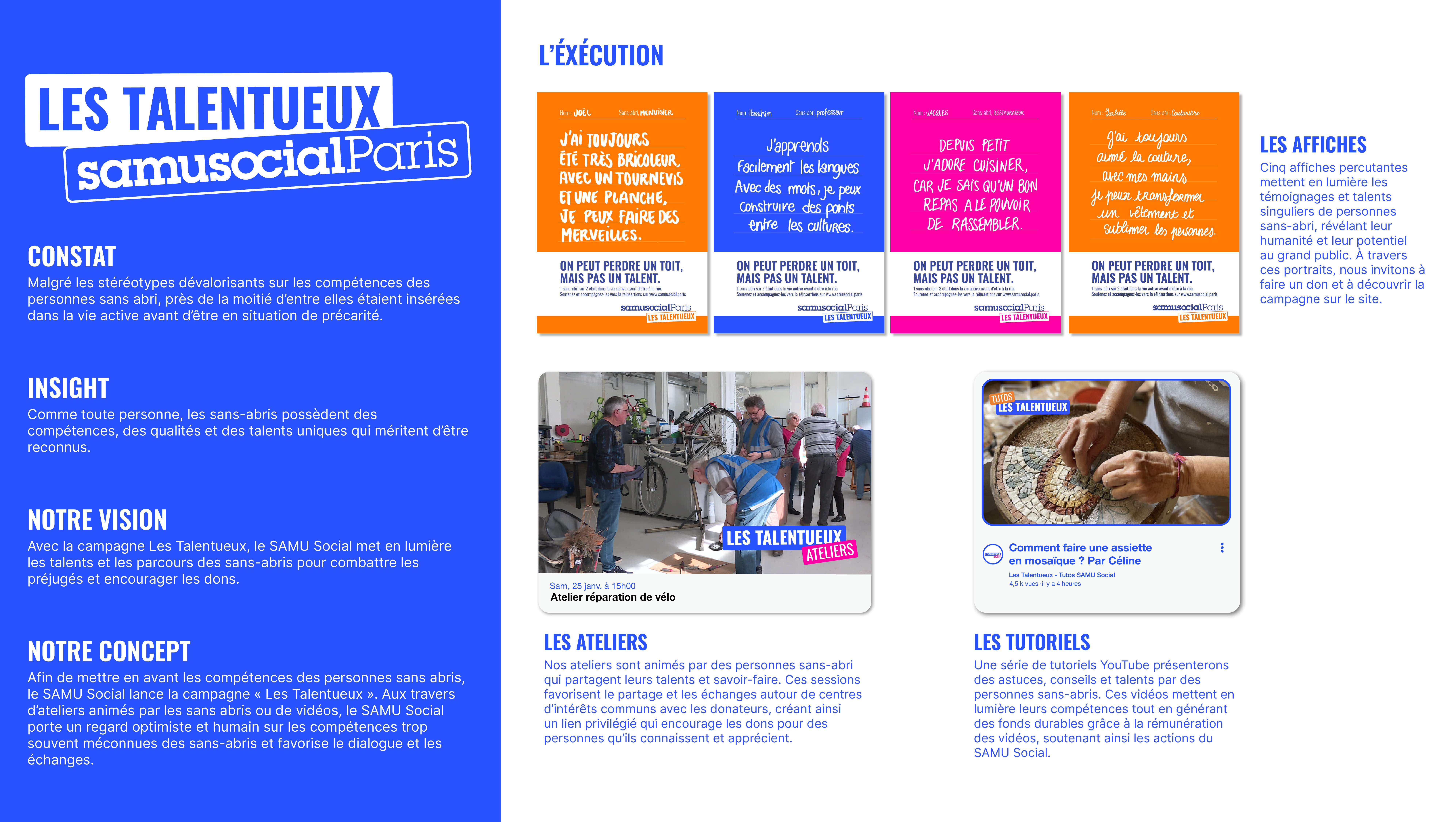 Afin de mettre en avant les compétences des personnes sans abris, le SAMU Social lance la campagne « Les Talentueux ». Aux travers d'ateliers animés par les sans abris ou de vidéos, le SAMU Social porte un regard optimiste et humain sur les compétences trop souvent méconnues des sans-abris et favorise le dialogue et les échanges.